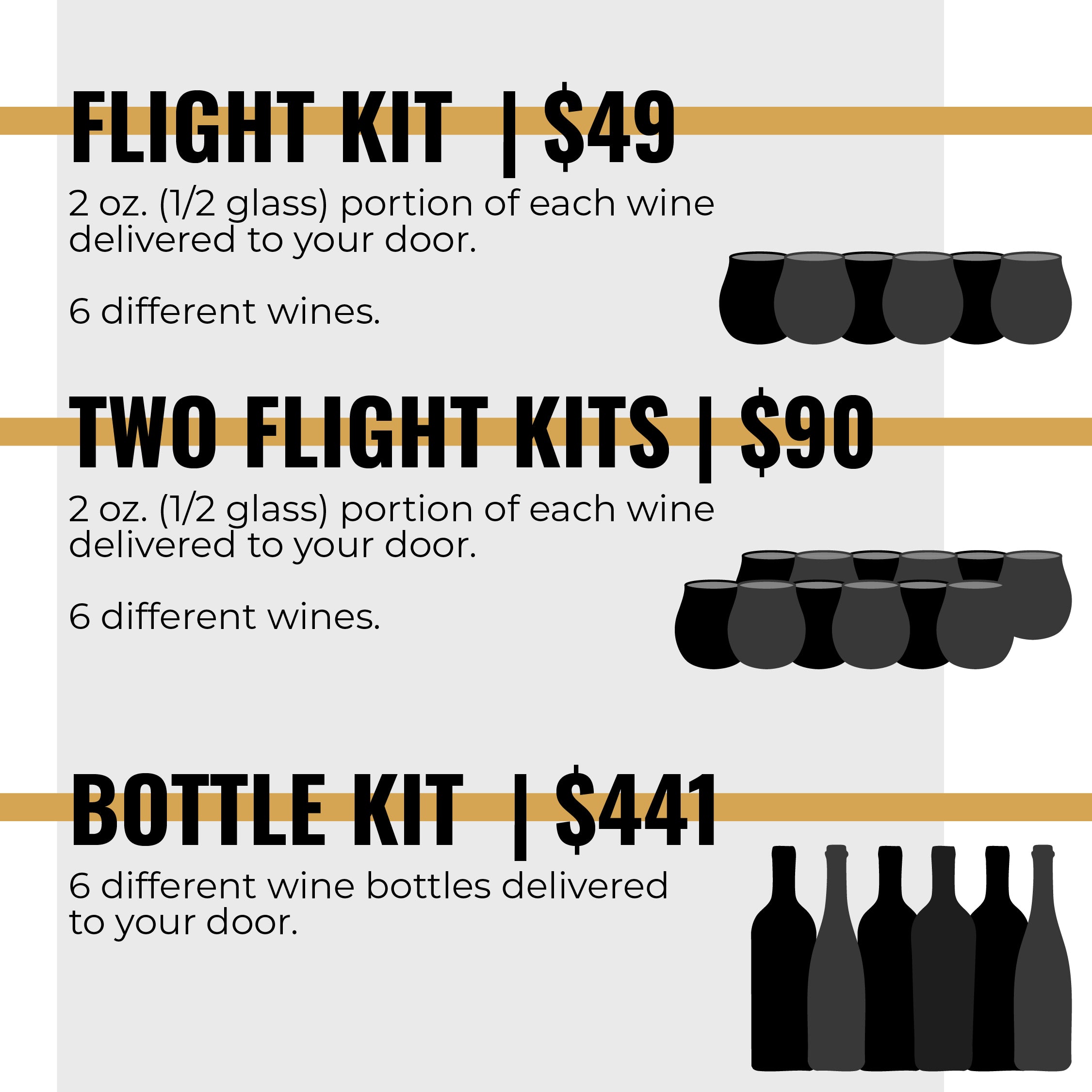 - Wine flight or bottle kit purchase deadline: 48 hours prior*